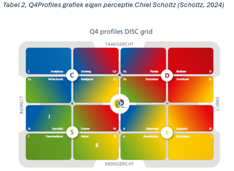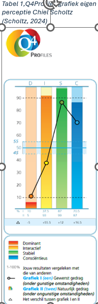 Uit het Q4Profiles rapport zijn verschillende tabellen met informatie gekomen. De bolletjes in tabel 1 laten een gewenst patroon zien. Onder gunstige omstandigheden (met weinig stress), er wordt bewust op een eigen wijze en optiek gehandeld die past bij de situatie. Dit gedrag is het meeste van de tijd aanwezig.